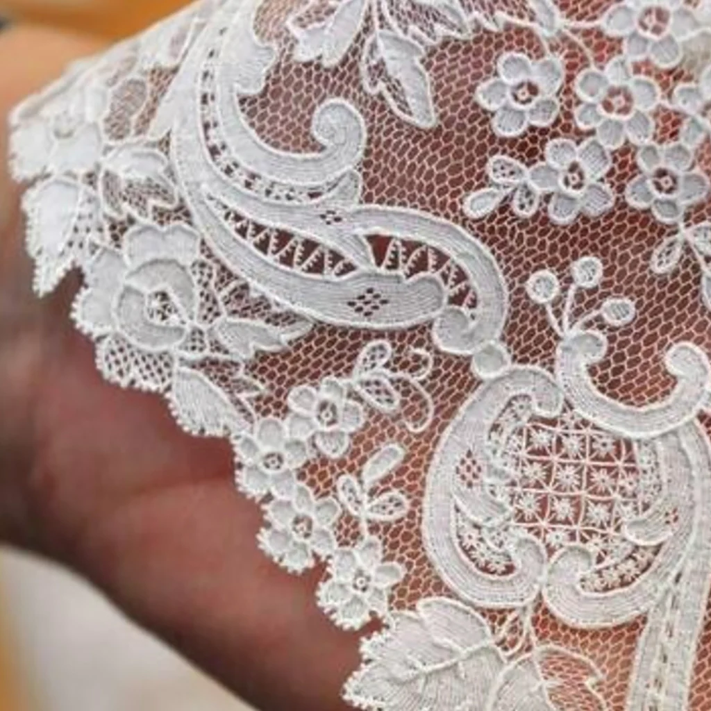 Alencon lace is an elegant, needlepoint lace featuring intricate floral patterns on a fine net background, often highlighted with corded details. Known for its durability and beauty, it is ideal for bridal gowns and haute couture.