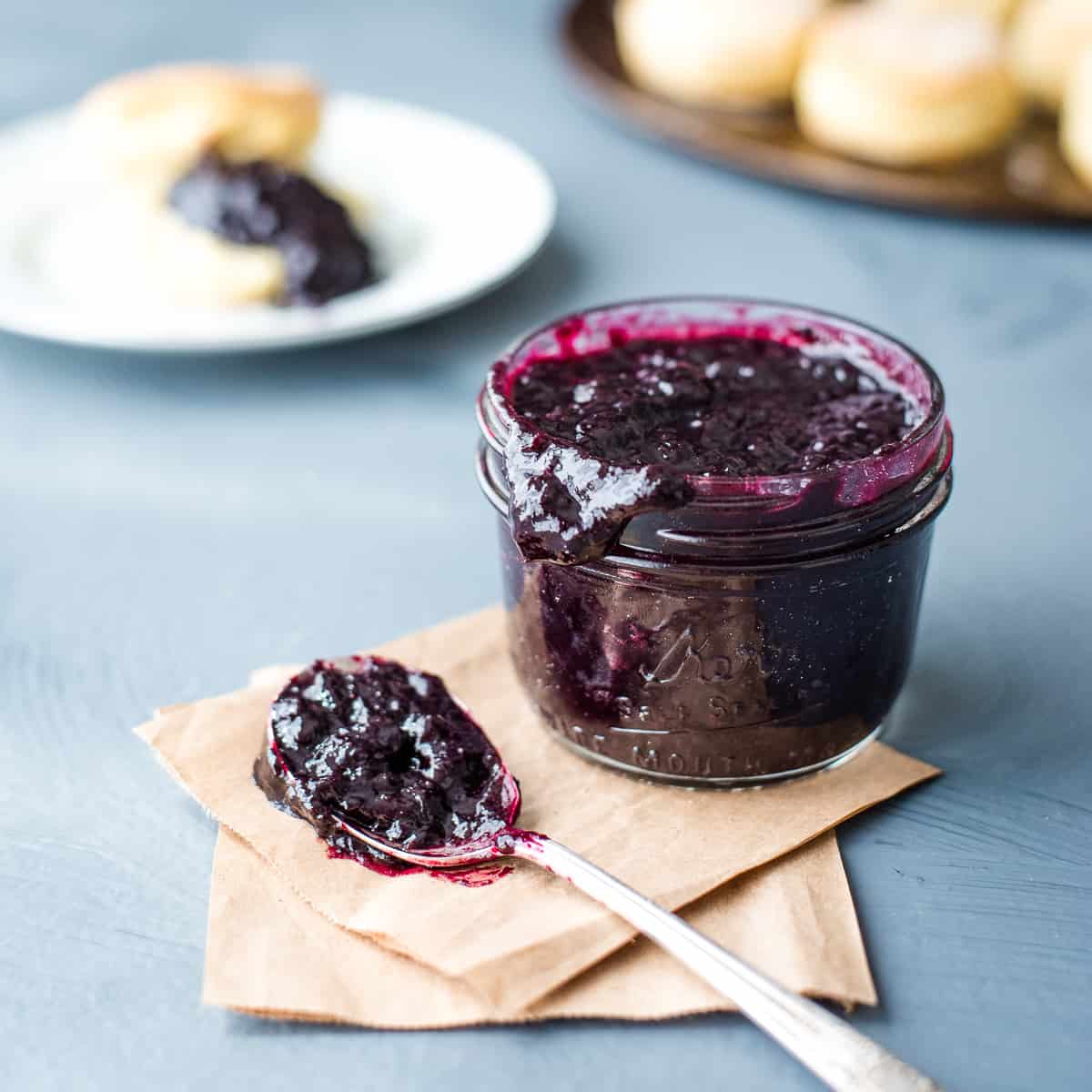 Blueberry jam is a sweet, tangy spread made from ripe blueberries, sugar, and pectin. It has a rich, deep color and a deliciously fruity taste, perfect for spreading on toast or pairing with desserts.