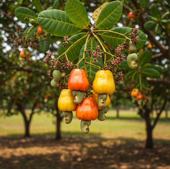 The cashew plant is a tropical tree that produces cashew nuts and cashew apples. It is widely grown for its nutritious nuts, which are used in snacks, sweets, and cooking.