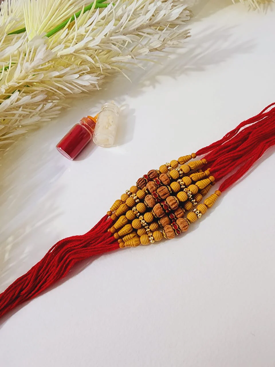 Chandan rakhis are made from sandalwood, known for its calming fragrance and auspicious properties. They symbolize love, protection, and traditional values in the Raksha Bandhan celebration.