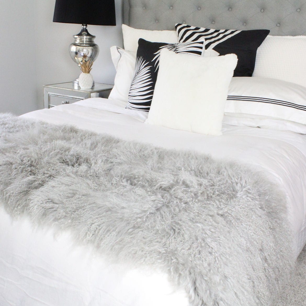 Faux fur bed runners are decorative fabric pieces made from synthetic, soft faux fur material. They add a luxurious and cozy feel to the bed, enhancing the room's aesthetic with their plush texture and stylish appeal, often used in colder months for warmth and elegance.