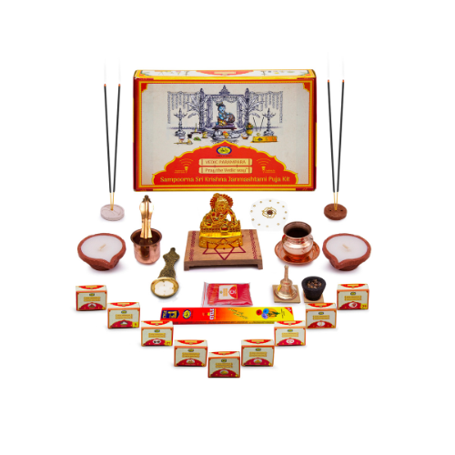 A Janmashtami puja kit includes essential items for worshiping Lord Krishna during the festival. It typically features an idol of baby Krishna, a puja thali for arranging offerings, and fresh flowers for decoration. The kit also contains fruits and sweets, such as laddus and bananas, along with incense sticks and a diya (oil lamp) for light. Holy water, chandan (sandalwood paste), haldi (turmeric), and kumkum are included for purification and offerings. Lastly, agarbatti is provided to create a sacred atmosphere, helping devotees perform the puja rituals with devotion.
