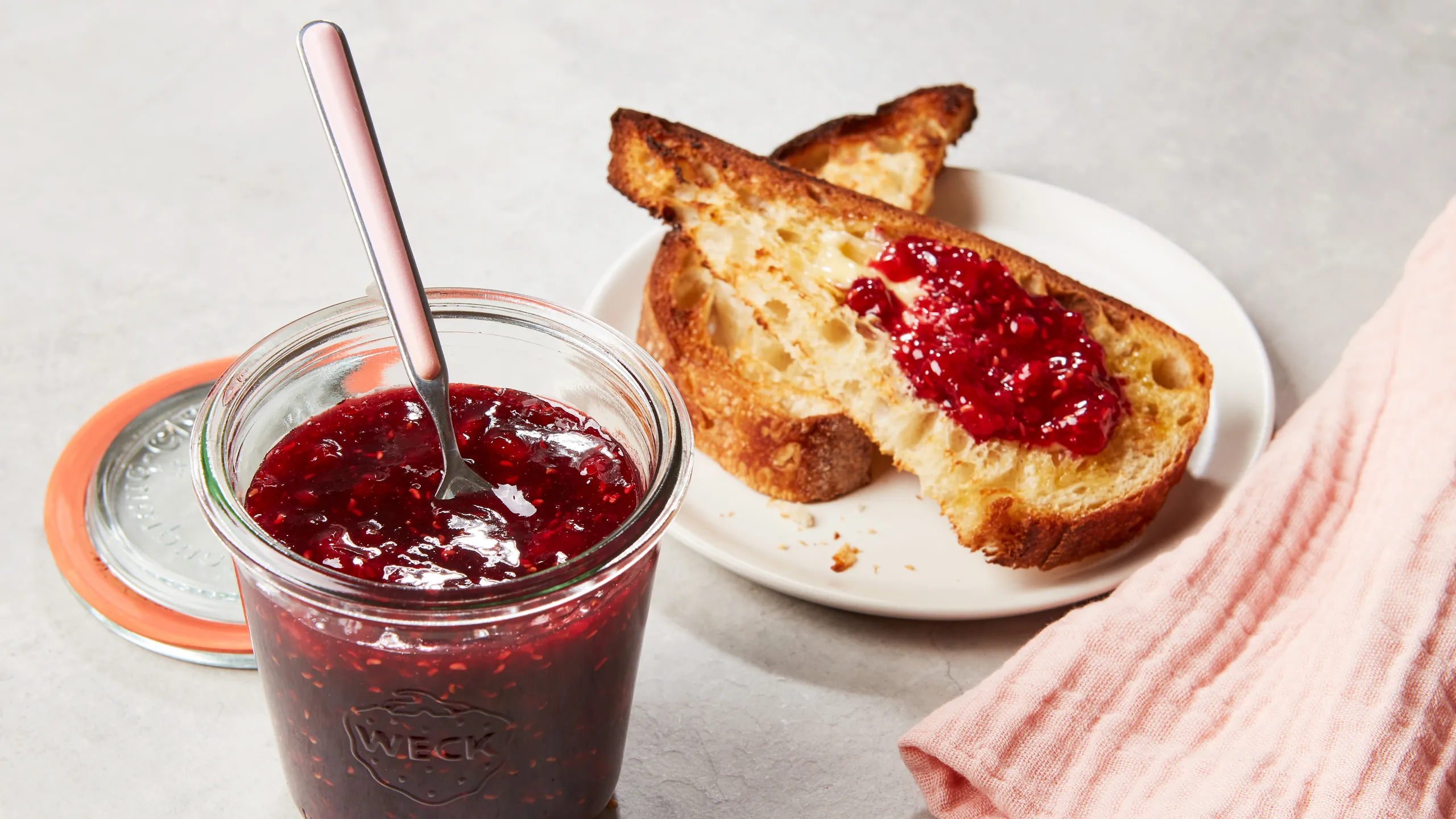 Jelly spread is a sweet, fruit-flavored spread made from fruit juice, sugar, and pectin, which is thickened to a gel-like consistency. It is commonly used on bread, toast, and desserts for a fruity, sugary flavor.