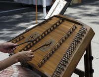The dulcimer is a stringed instrument with a flat, trapezoidal body. Played by striking or plucking the strings, it produces a melodic, harmonic sound, commonly used in folk and traditional music.